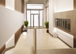 Базовой цветовой гаммой при оформлении красивых вестибюлей станут теплые тона и сочетание нежных бежевых и коричневых оттенков. Проектом предусмотрено разноуровневое освещение. Стены будут отделаны декоративными панелями. Также запланирована фактурная покраска.